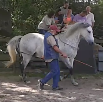 Bei diesem Spiel geht es darum, das Pferd mit Hilfe des Seils vorwärts und rückwärts zu schicken. Das Seil Stück für Stück und ein wenig energisch einholen bedeutet dem Pferd vorwärts zu treten, stärkeres Wedeln mit dem Seil dirigiert es rückwärts. Sobald das Pferd die richtige Reaktion zeigt, hört man auf, das Seil zu bewegen.